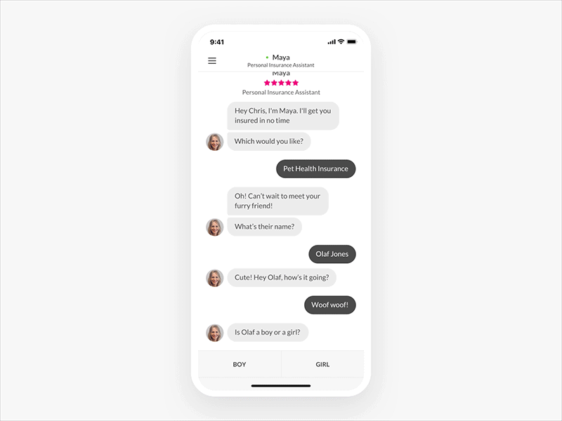 Maya will start off by asking a few basic questions to get to know you and your furry friend better. What sort of stuff? Well, information like where you live, whether your pup Luna is a boy or girl, and details on their age, breed, and weight. This helps us design the best coverage for your pet.